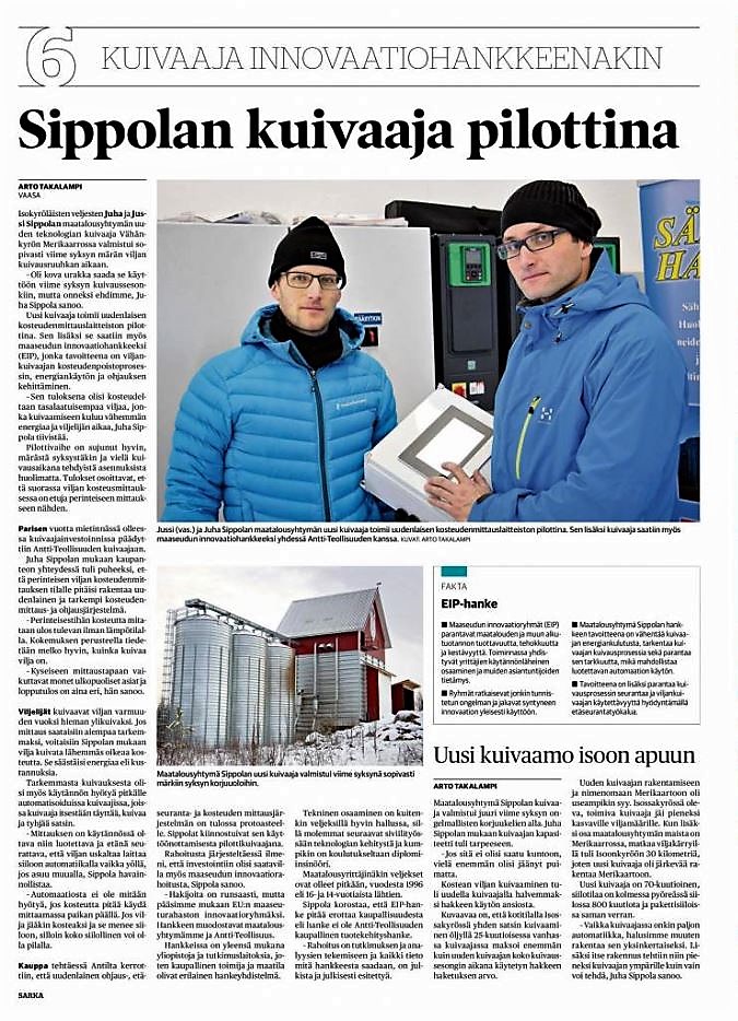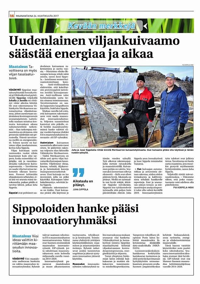 Hankkeessa tullaan kehittämään viljankuivaamon kosteudenpoistoprosessia, energiankäyttöä sekä siihen liittyvää ohjausta. Työ pyrkii ratkaisemaan viljankuivausprosessin tunnettuja ongelmia. Ongelmia aiheuttavat kuivattavan viljan/kasvin ja ympäristön olosuhteiden vaihtelut sekä kuivausprosessin ohjausarvoissa olevat epätarkkuudet. Hanke tuo yhteen alan toimijoita, tutkijoita ja käyttäjiä parhaimpien tulosten saavuttamiseksi. Hankkeessa seurataan muun muassa käytettävän energian määrää ja kuivaukseen kuluvaa aikaa. Hankkeesta julkaistaan väliraportti 2018 alussa ja loppuraportti tullaan julkaisemaan 2019 keväällä. Raportti julkaistaan myös eurooppalaisen innovaatiokumppanuuden verkoston kautta.